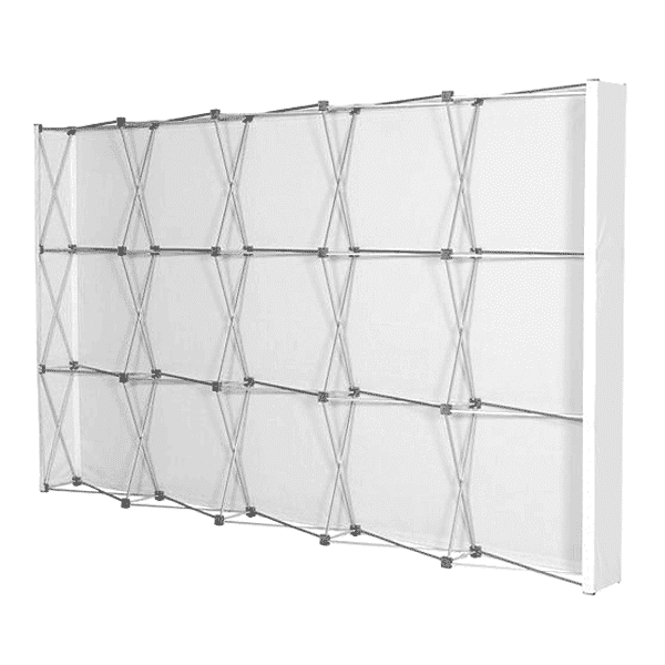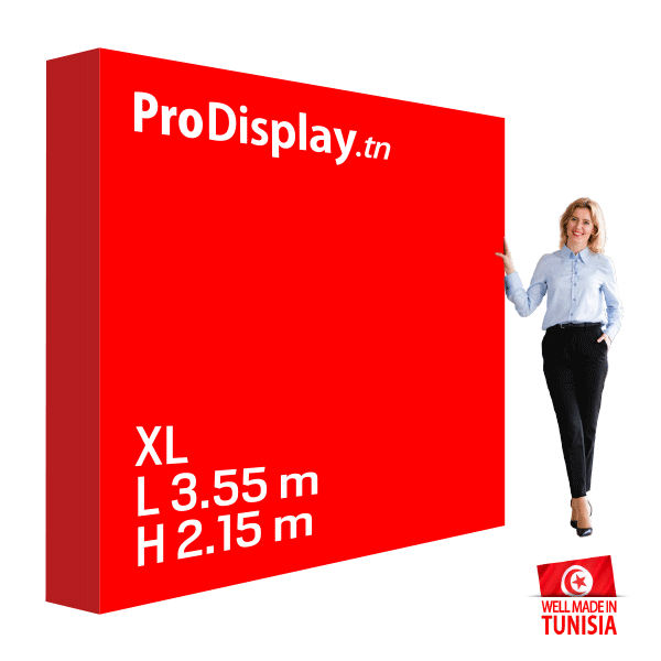 Stand parapluie textile droit XL : Largeur 3.55 m / Hauteur 2.15 m + visuel textile blackout. Structure légère, facile à monter et à transporter. Livré avec sac de transport.